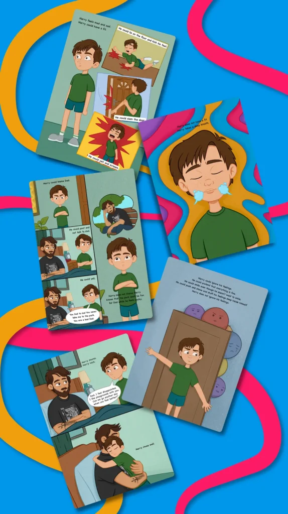 Expressive and colorful illustrations in a children’s comic style, bringing Amara’s journey of self-discovery and self-love to life.